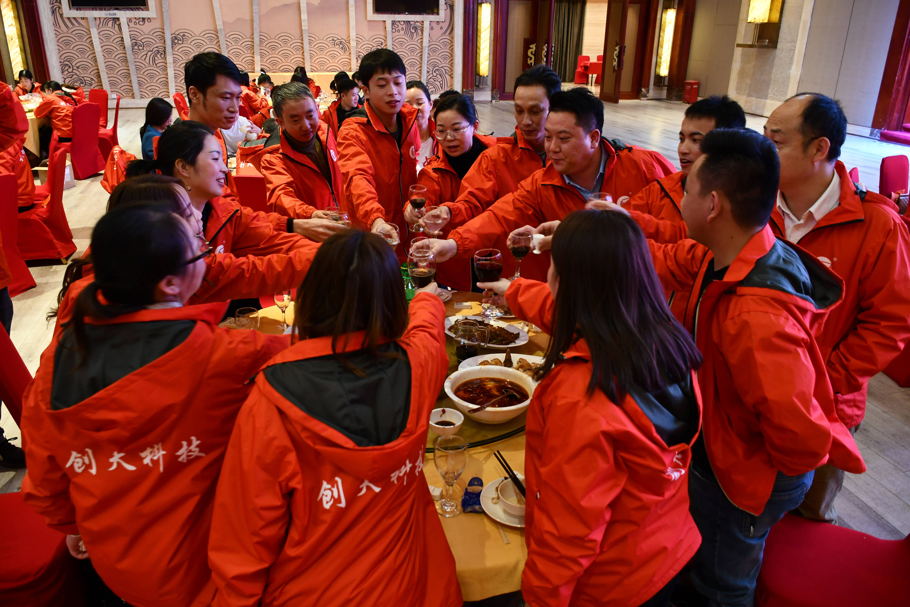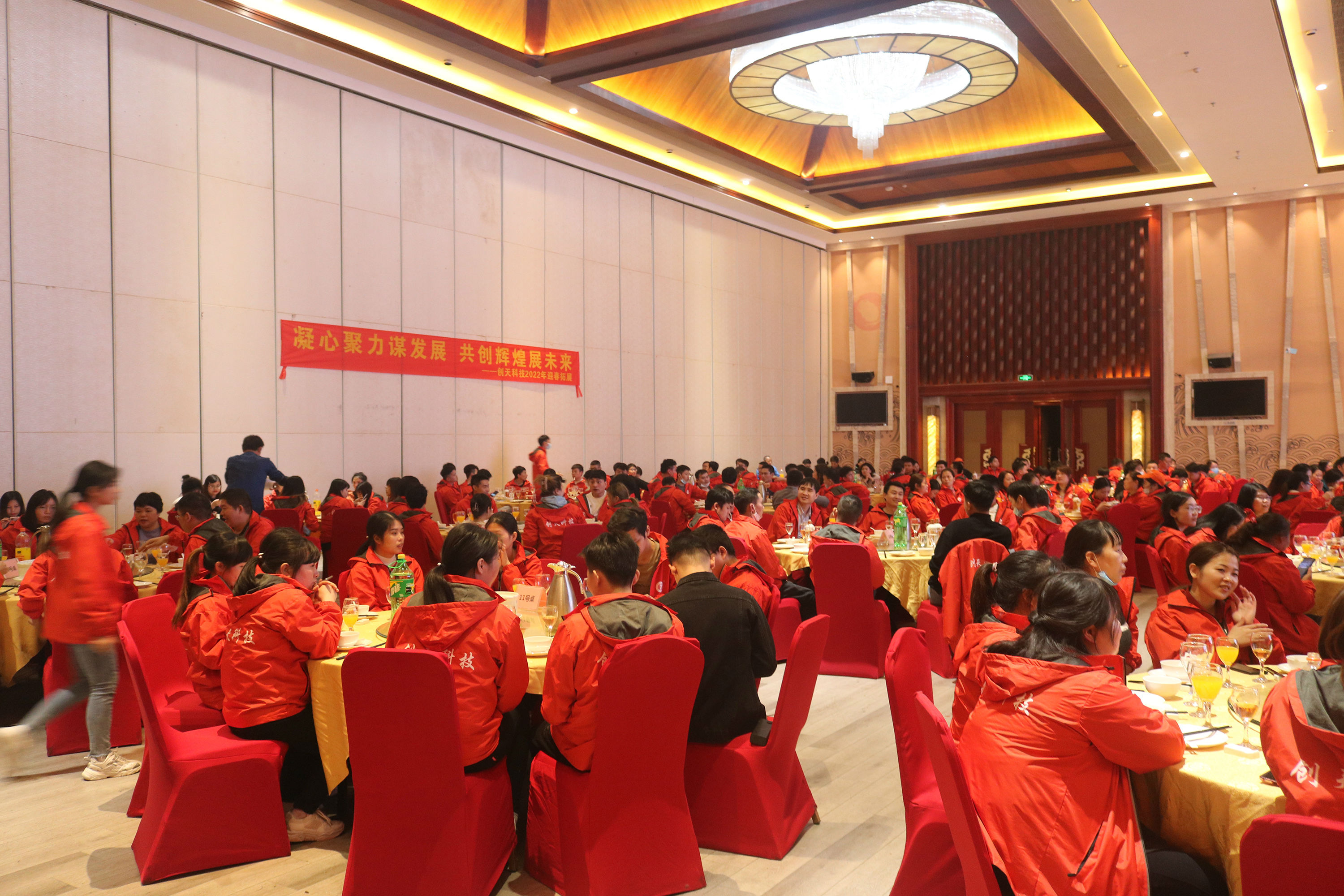 晚上大家在酒店內(nèi)富龍宴會(huì)廳歡聚一堂,享用晚宴,謝總上臺(tái)致辭。